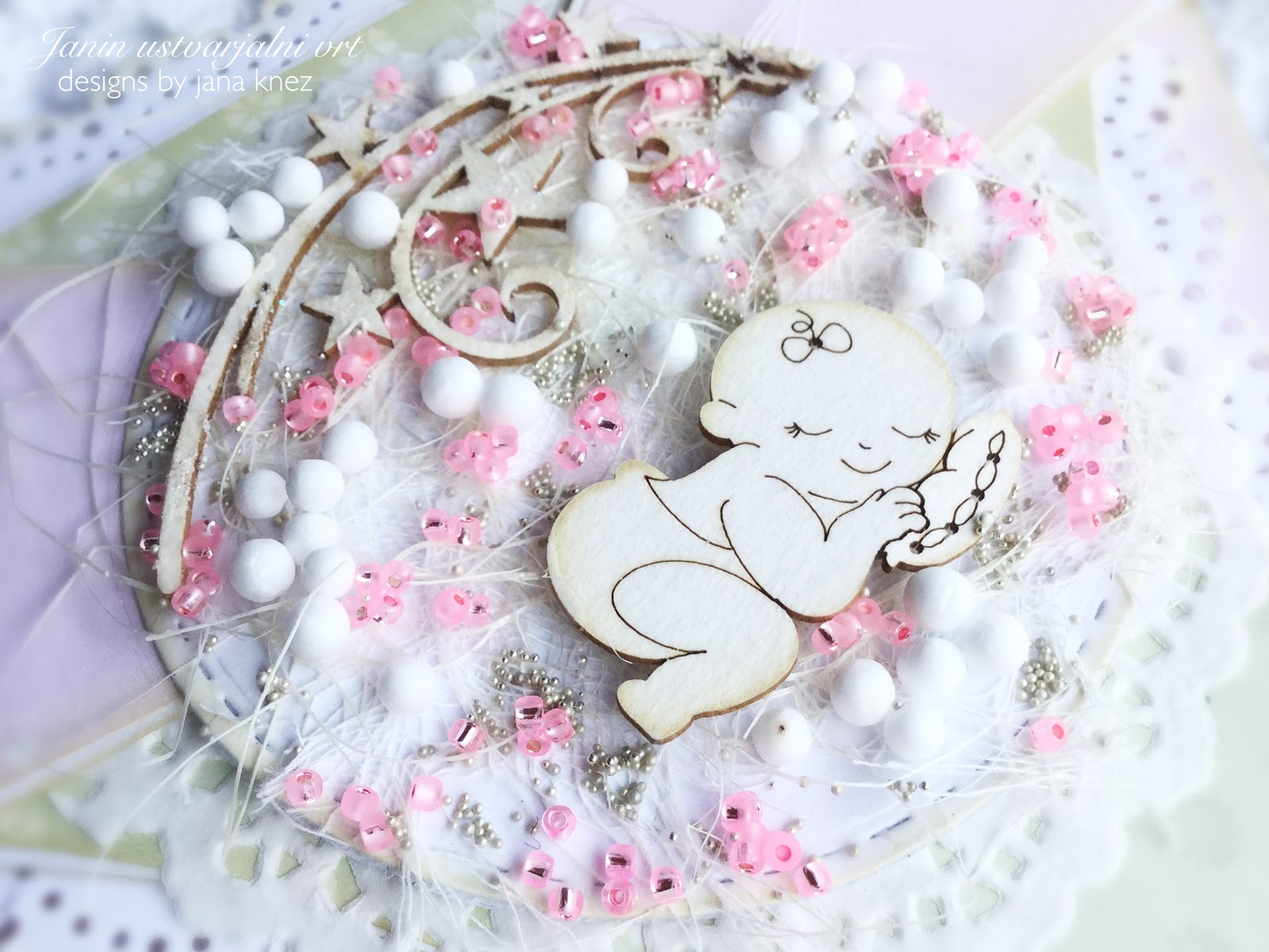 Voščilnici plenički sta izrezani ročno in oblikovani v mešani tehniki - mixed medii, ker sem uporabila kar nekaj različnih medijev. Osrednja motiva dojenčica in dojenček sta lepinkina izrezka Scrapiniec, prav tako nežne zvezdice. Na koncu sem uporabila še kroglice, plastične in mikro perlice. Pleničke pa lahko uporabimo kot vabila na dojenčkovo zabavo - baby shower. V tem primeru jih okrasimo bolj preprosto.