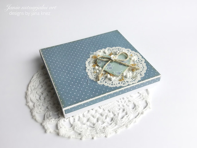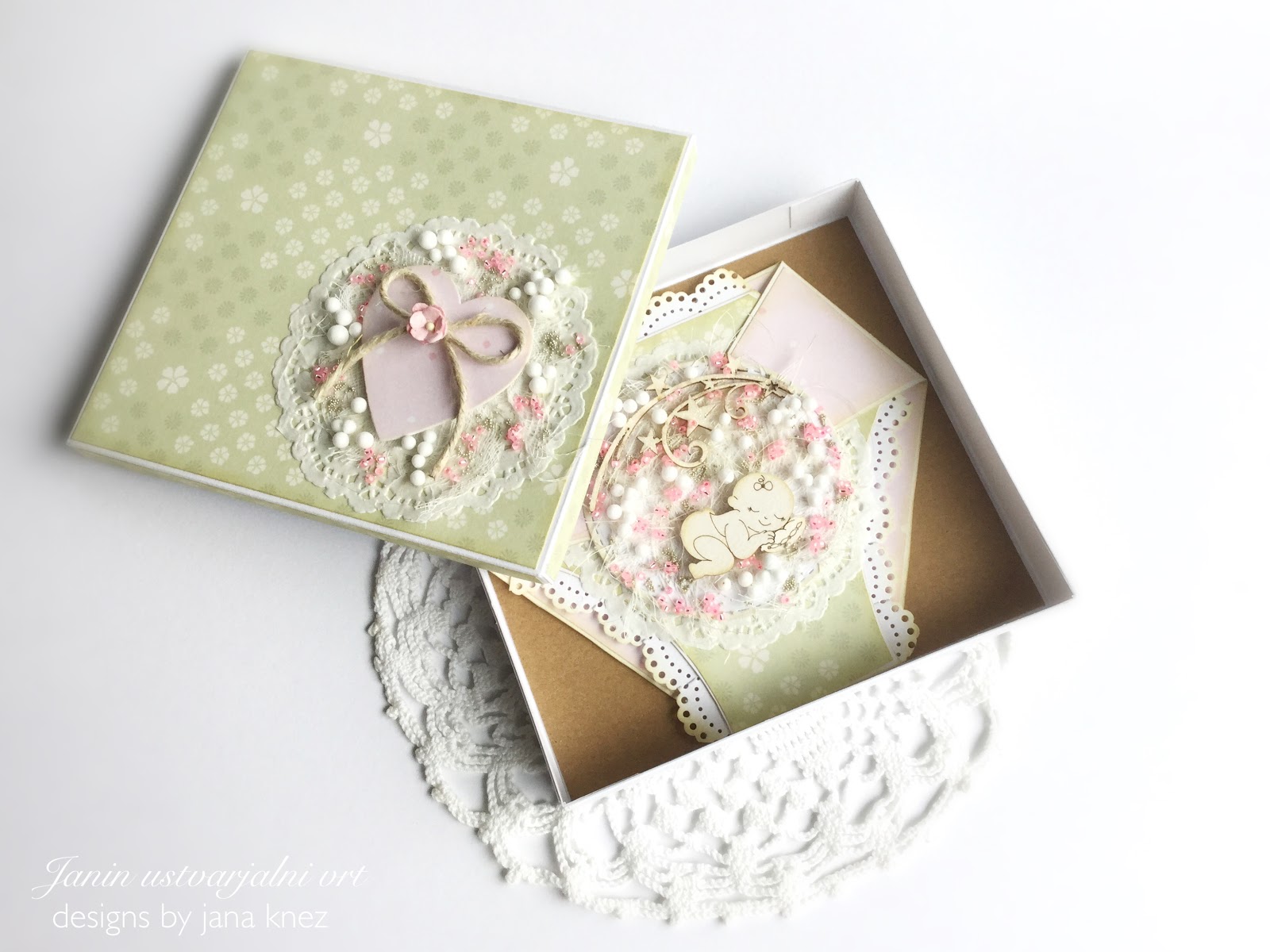 Kot sem obljubila v prejšnji objavi, vas bom v naslednjih dneh razveseljevala z novimi, drugačnimi izdelki. Petek je in spet sem gostja ustvarjalnega tima Scrapping4Fun. V teh štirinajstih dneh bomo ustvarjali izdelke v drugačnih oblikah z več pregibi, saj se 92. izziv imenuje Different Shape and Folds. Oblikovala sem voščilnico pleničko oz. kar dve - eno za dojenčico in drugo za dojenčka. V notranjosti se poleg posvetila skriva še denarni žepek. Zraven sem izdelala še škatlici, ki sta nežno okrašeni.